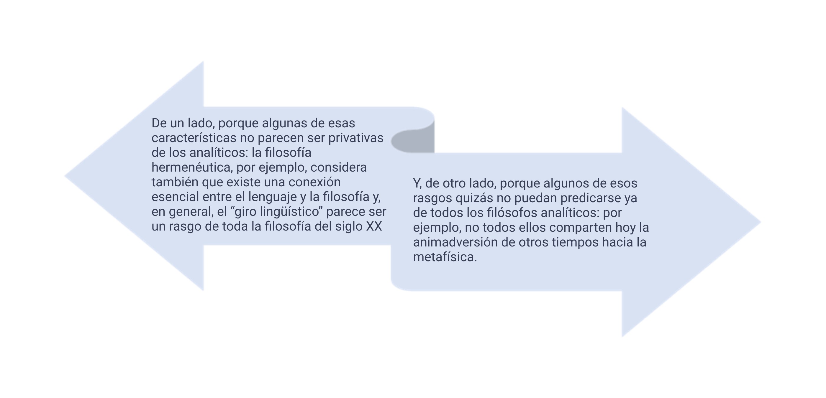 Atienza menciona que “A decir verdad, si ya desde hace tiempo se decía que lo único que tenían en común los autores que suelen adscribirse a la gran variedad de corrientes que integra la filosofía analítica eran ciertos “rasgos de familia”, como la tendencia a ver una conexión íntima entre la filosofía y el lenguaje, la crítica –o al menos, la actitud de recelo– hacia la metafísica, la actitud positiva hacia el saber científico y el reconocimiento de que el análisis (la descomposición de un todo –la realidad– en partes) constituye una condición necesaria del filosofar (Rabossi 1973), hay que reconocer que, con el paso del tiempo, el poder de definición de esas señas de identidad es mucho menor”.